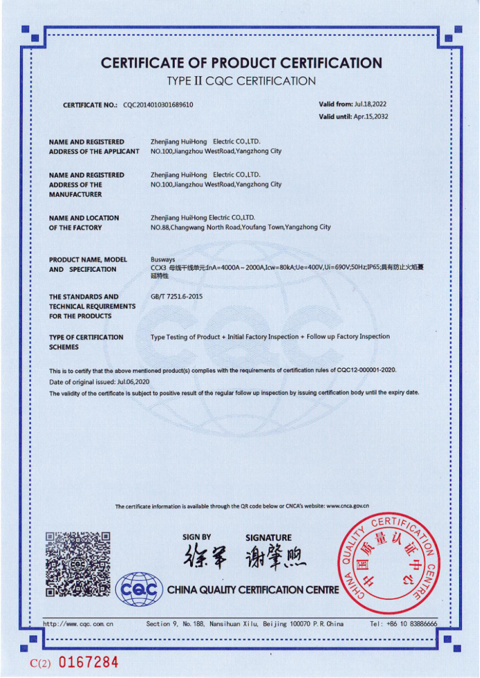 以上就是小编为大家介绍的产品认证证书二型自愿认证(密集式母线槽4000-2000)的全部内容,如果大家还对相关的内容感兴趣,请持续关注镇江辉虹电气有限公司